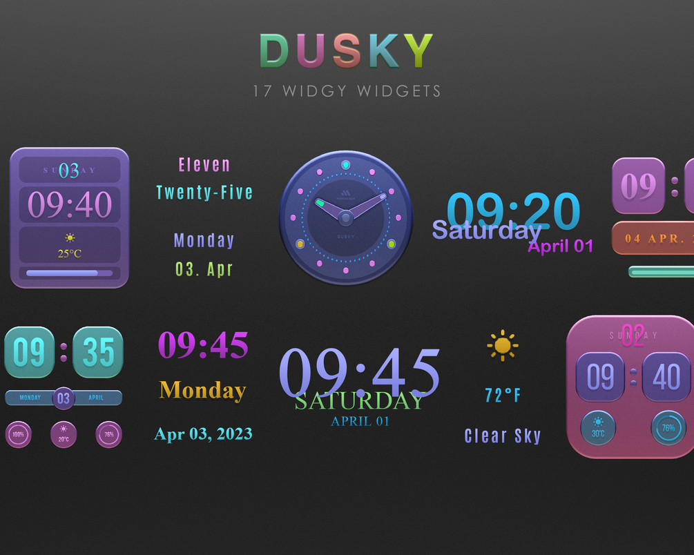 Many widgets have several hidden graphics, depending on the style, these can be swapped out with 1-2 clicks. You can change the shapes, colors and positions of the texts and symbols (weather, time, etc.) at any time according to your taste.