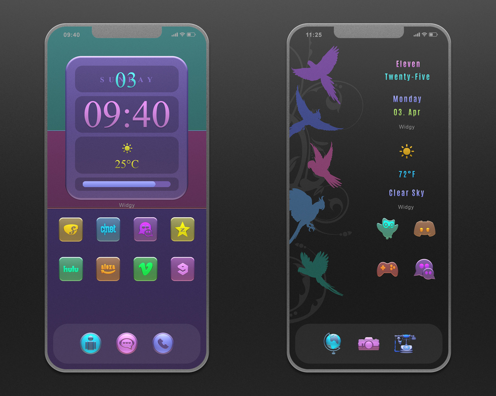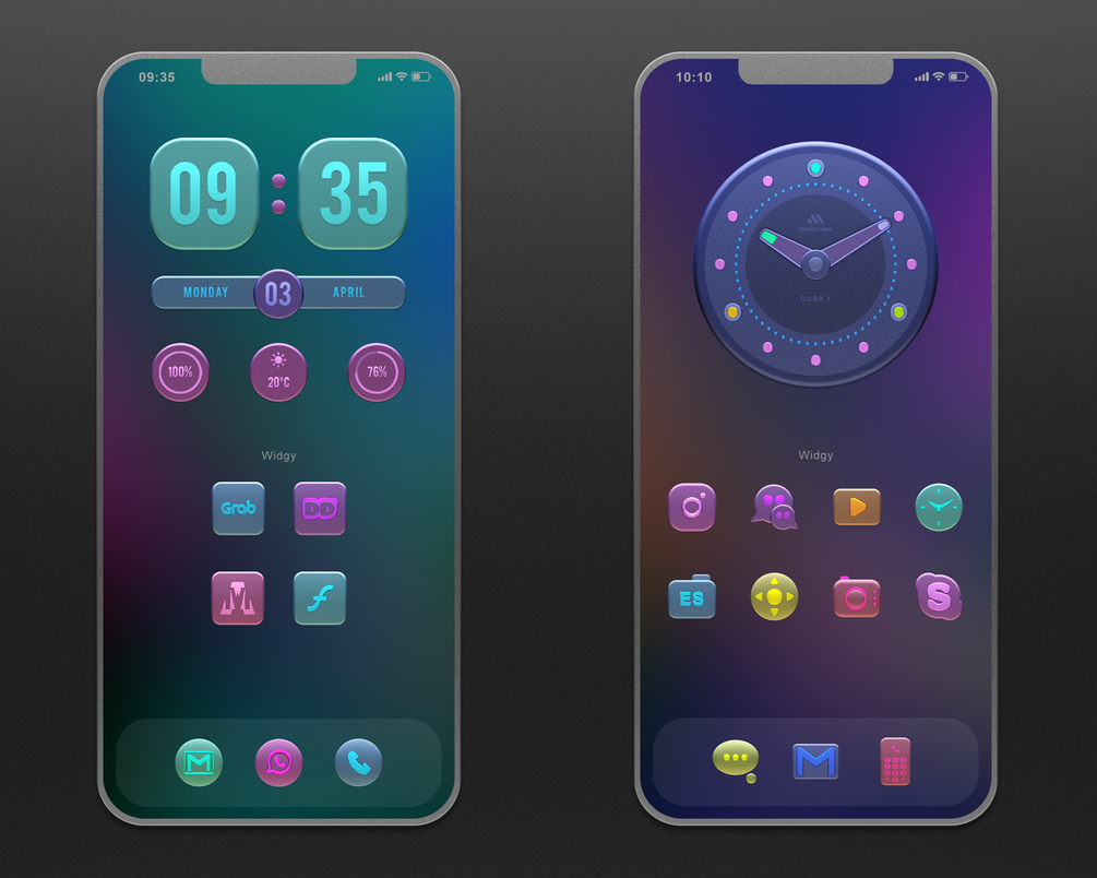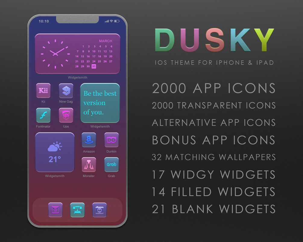 The icons and widgets of the DUSKY Theme are very colorful and minimalistic. The icons and widgets have a slight 3D effect. The DUSKY Theme has several matching backgrounds to choose from. You will get an individual and magnificent style for your iPhone and iPad with this Aesthetic colorful design.