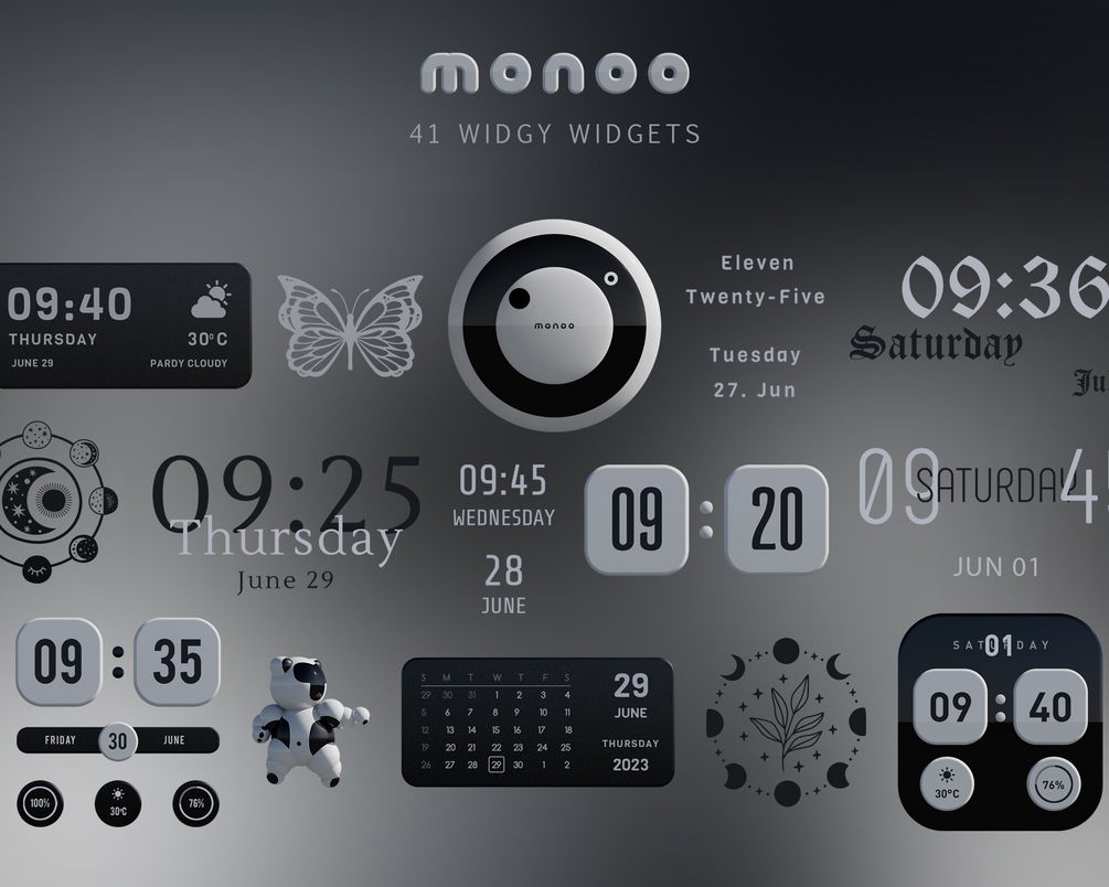 To use the Widgy Widgets, you first have to download the Widgy App from the Apple Store (the app is free). The time, date, battery indicator or the weather is displayed in the Widgy widgets and in different versions and in a matching MONOO design style.