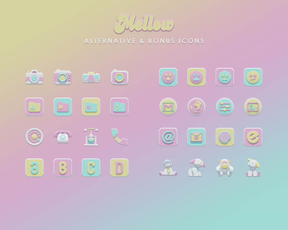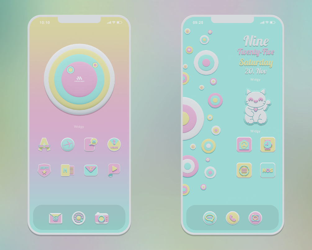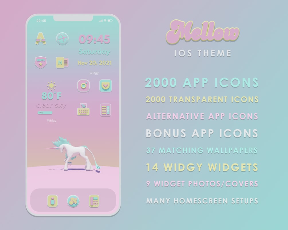 The icons and widgets of the MELLOW THEME have Pink, Yellow and Blue surfaces with white elements. The icons and widgets have a slight 3D effect. The MELLOW Theme has several matching backgrounds to choose from. You will get an individual and magnificent style for your iPhone and iPad with this exclusive design.