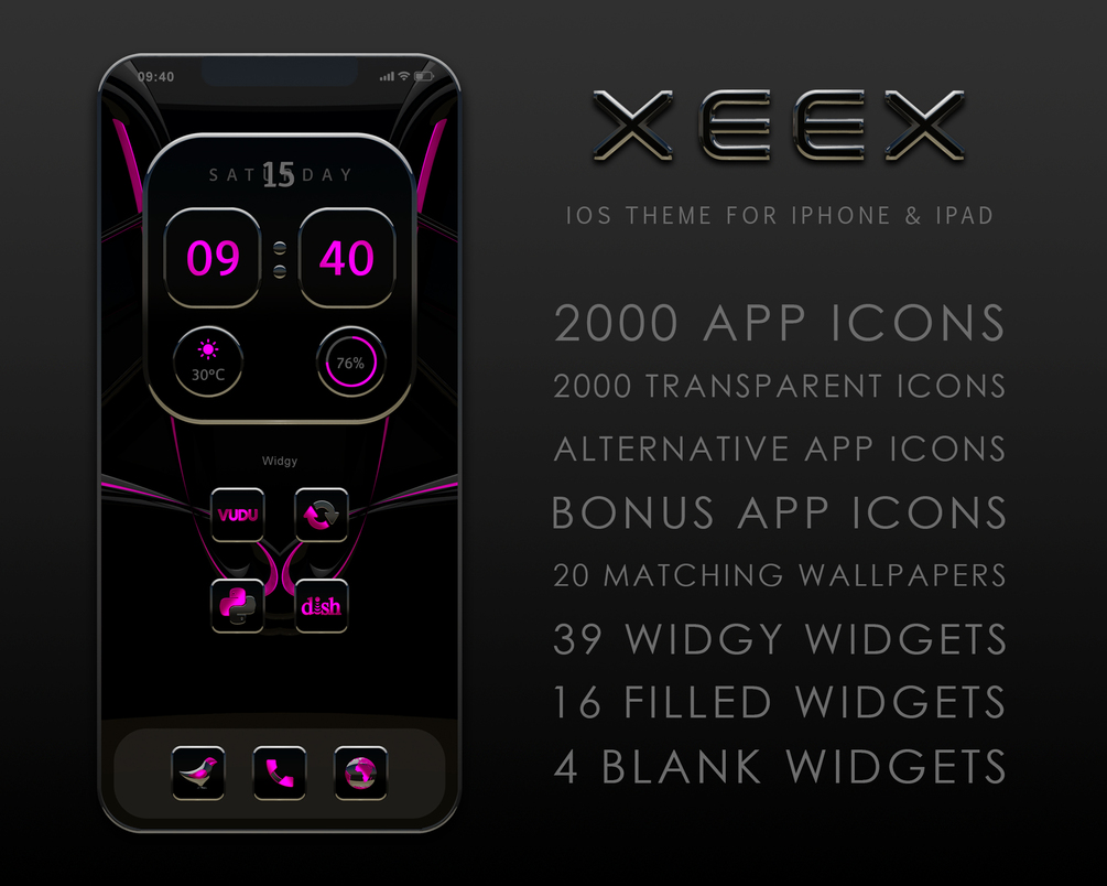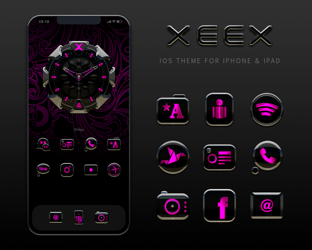 The icons and widgets of the XEEX Theme have a black surface with pinkmetallic and silver elements. The icons and widgets have a slight 3D effect and are shaded. The XEEX Theme has several matching backgrounds to choose from. You will get an individual and magnificent style for your Smartphone, iPad or Tablet with this modern and aesthetic design.