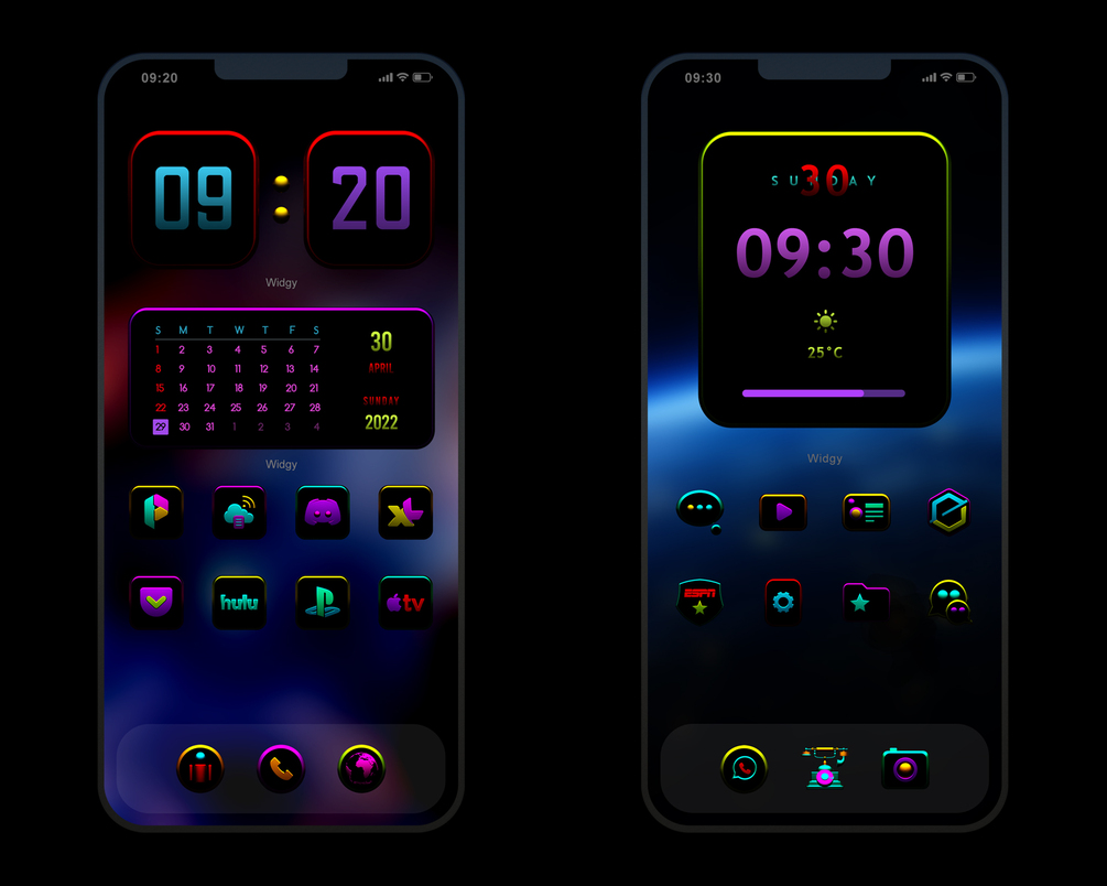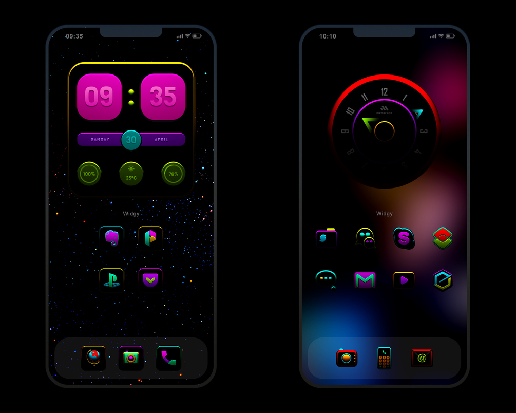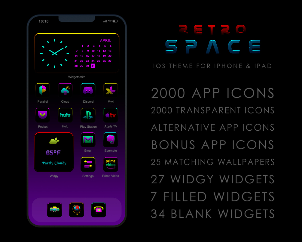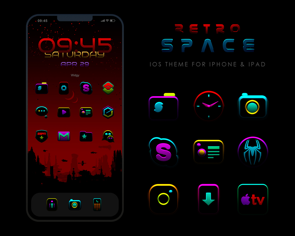 The icons and widgets of the RETRO SPACE Theme have a black surface with bright colourfull elements. The icons and widgets have a slight 3D effect. The RETRO SPACE Theme has several matching backgrounds to choose from. You will get an individual and magnificent style for your iPhone and iPad with this exclusive high quality Vintage Retro Space design.
