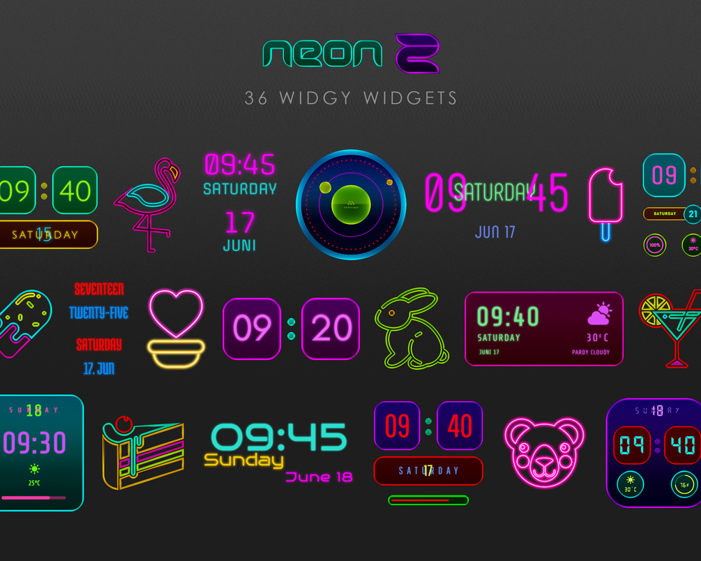 Many widgets have several hidden graphics, depending on the style, these can be swapped out with 1-2 clicks. You can change the shapes, colors and positions of the texts and symbols (weather, time, etc.) at any time according to your taste.