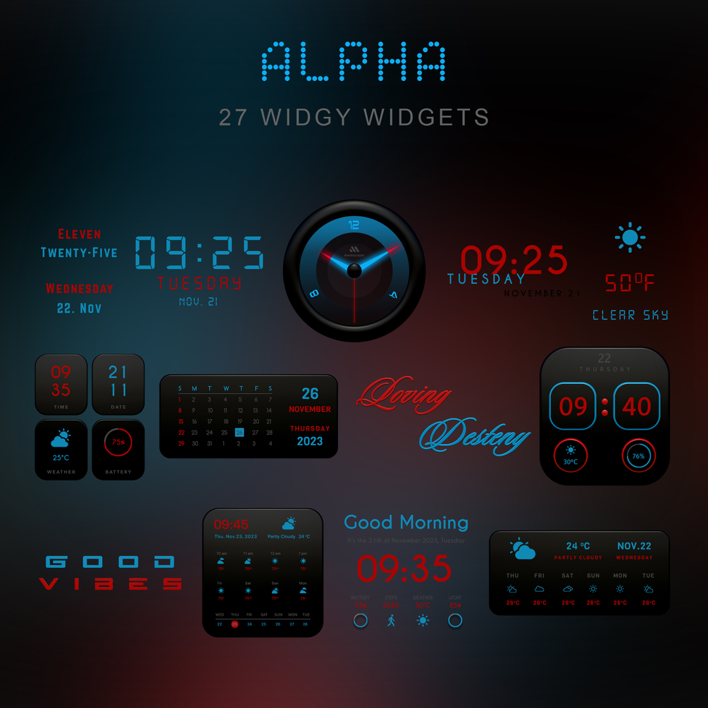 Many widgets have several hidden graphics, depending on the style, these can be swapped out with 1-2 clicks. You can change the shapes, colors and positions of the texts and symbols (weather, time, etc.) at any time according to your taste.